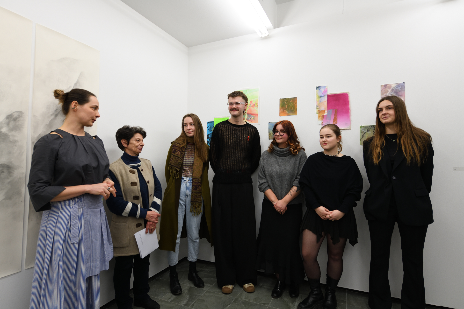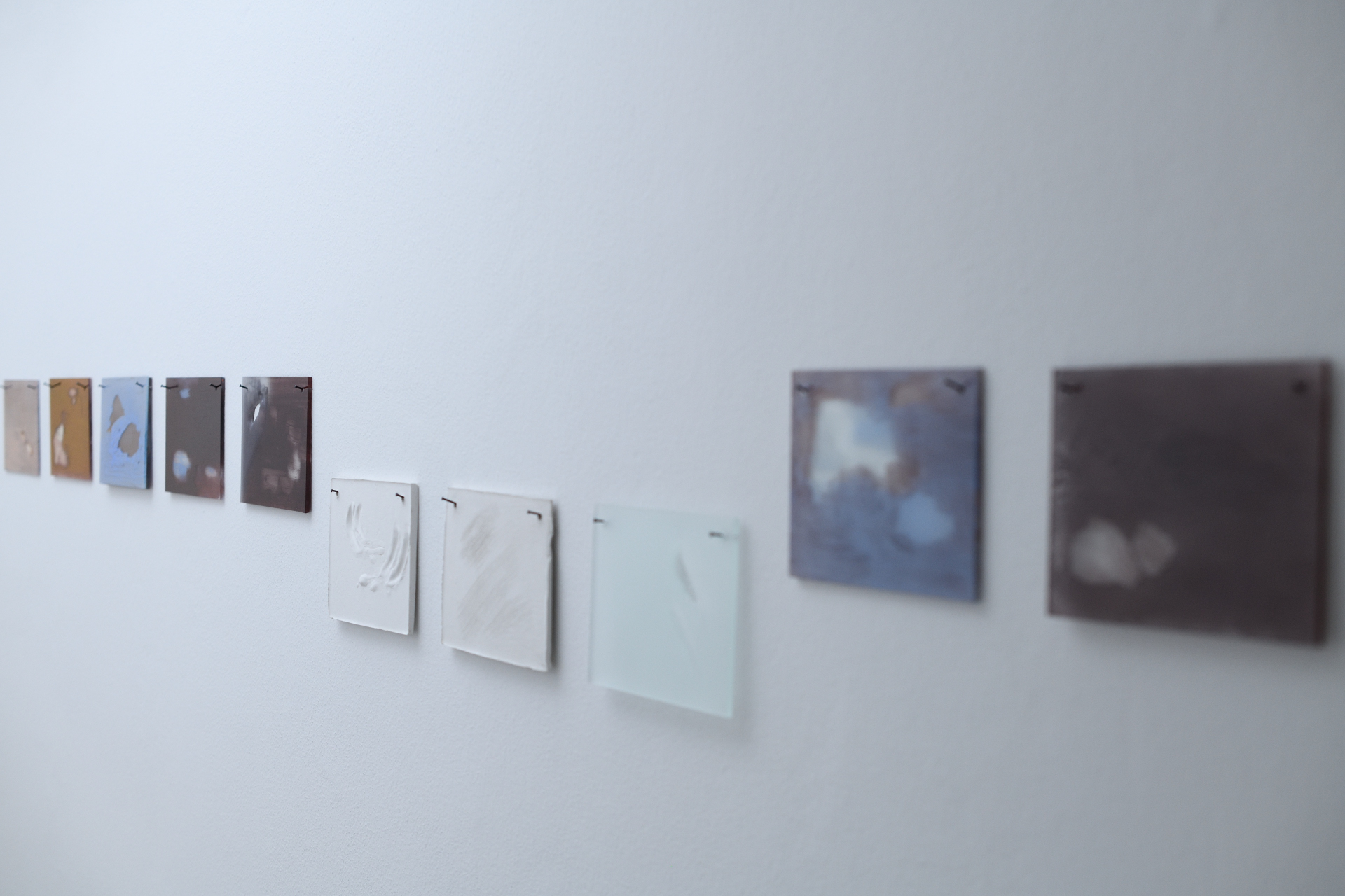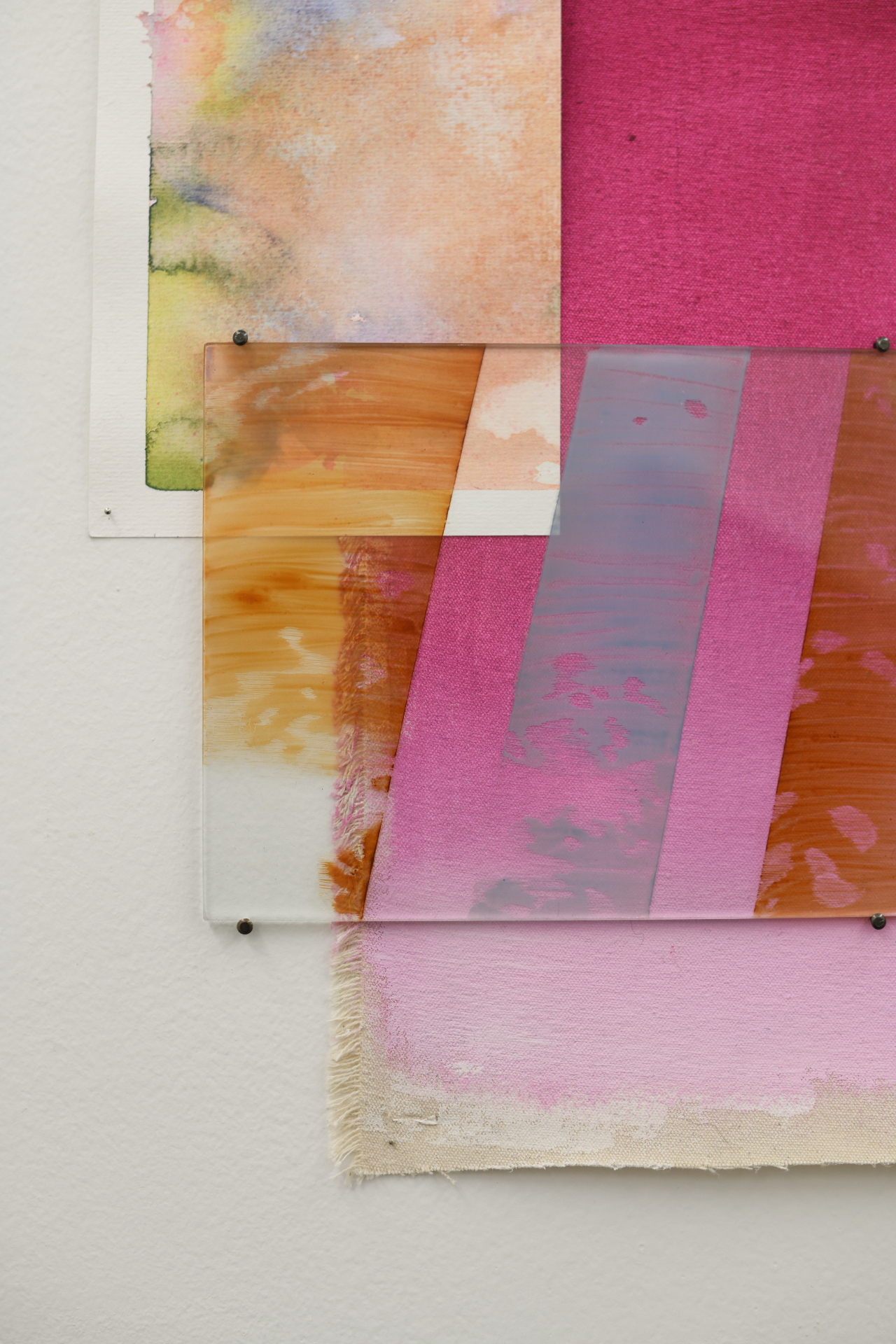 Výstava Cez vrstvy prezentuje prácu piatich študentov Vysokej školy výtvarných umení, ktorých spája jeden technologický predmet ateliéru Sklo – maľba na skle. Ambíciou výstavy je nielen odprezentovať autorské pohľady jednotlivých umelcov, ale ponúknuť aj širší náhľad do problematiky a súčasných možností maľby na sklo. Táto sféra je vo svete umenia stále tak trochu bezdomovcom. Dvojdomosť maľby na skle vychádza z pozície medzi užitým a voľným. Jej korene môžeme hľadať v oblasti dekoru, avšak priestor, ktorý sa tu postupne vytvára, už patrí voľnému umeniu. Tabuľa skla ako podklad a sklárske farby, ktoré treba vypaľovať, prinášajú problémy – a teda aj možnosti riešenia, ktoré sú veľmi špecifické, originálne a inovatívne. Treba myslieť v jednotlivých vrstvách, vedieť si predstaviť ich sčítavanie alebo prekrývanie. Do hry tu vstupuje aj svetlo, lesk, mat, transparentnosť a samotná hmota skla. Trpezlivosť a cit pre materiál sú nevyhnutné. V rámci slovenského kontextu nadväzujeme na väčšie výstavné projekty Vedieť, vidieť, ma- ľovať / Sklo ako plátno (Galéria Médium, 2017), New Glass Folder (Oravská galéria, 2019) a Obraz ako topografia krajiny (Galéria Miloša Alexandra Bazovského, 2023). Špecifickosťou výstavy Cez vrstvy je zameranie autorov a autoriek predovšetkým na médium a tech nológiu, ktorá sa stáva podnetom pre tému. Povedané inak – fascinácia výtvarným problémom generuje obsah alebo sa ním priamo stáva. V diele Martina Drusku môžeme vidieť abstraktnú maľbu, hru s lesklým, premen livým a matným, opieskovaným povrchom. Predovšetkým nás však upozorňuje na hmotu skla, kde sa brus – tradičná technológia dekorovania skla – mení na kresbový zásah do hmoty. Vanesa Šamajová využíva vrstvenie, viditeľnú stopu štetca, jeho štruktúry a rôzne fázy schnutia sklárskej farby. Niekedy do svojich malieb zasahuje prstom, tvoriac tak gesto dotyku a vymazávania. Toto gesto opakuje v sadrových odliatkoch, v ktorých rovnako ako pri maľbách, zachytáva krehký moment medzi suchým a mokrým. Klára Mária Švorcová ťaží z transparentnosti skla a z faktu, že tabuľa má vždy dve strany, teda aj dve plochy na spracovanie. Tiež využíva grafickú stránku sklárskej farby, do ktorej je možné po vysušení (ale ešte pred výpalom) škrabať, a tým de facto kresliť. Takto nám vzniká hra s pozitívom a negatívom aj svetlom a tieňom. Sofia Tokošová je jediná zo skupiny, ktorá študuje primárne v ateliéri maľby, preto je jej prístup k médiu ovplyvnený touto skúsenosťou. Vo svojich dielach hľadá prepojenie s inými materiálmi, najmä s papierom a plátnom. V štruktúrach, ktoré vychádzajú z prírody a tieňov, hľadá polohu medzi konkrétnym a abstraktným, často používajúc veľmi jasné, až „toxické“ farby. Lucia Kupcová vo svojom diele vychádza z postupne zbieraných skíc rieky. Snaží sa o zachytenie jej toku, premenlivosti, nestálosti. „Jednotlivé kresby už nefungujú ako samo statné záznamy konkrétneho momentu, ale ako súčasť súvislého celku. Čiastočná nepriehľadnosť zároveň zdôrazňuje napätie medzi odhalením a skrytím.“ Sklenený objekt je v tomto prípade doplnený o kresbu na papieri, čím sa tvorí dialóg medzi médiami, časovosťou kresby a záznamu. Naše nadšenie pre toto médium podnecuje vidina možnosti niečoho nového, inšpiratívneho, jedinečného. Istým spôsobom je to stále terra incognita – maľba na sklo je rovnako lákavá a dobrodružná ako výpravy do neznámej zeme.